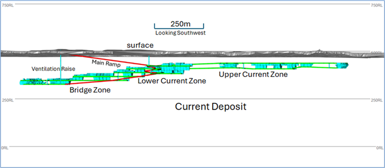 Die Lagerstätte Current wird über ein Portal von der Oberfläche aus erschlossen. Die Produktionshochlaufphase ist auf 18 Monate angelegt und sieht eine nominale Jahresproduktion von 0,9 Mio. Tonnen Lohnaufbereitungsmaterial vor. Die Haupt-Rampe führt weiter in Richtung Lagerstätte Escape, wo die Produktion im hochgradigen Escape-Bereich im vierten Produktionsjahr beginnen soll.