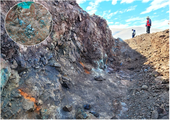 Copper mineralization is associated with copper oxides and sulfides hosted in intrusive and volcanic rocks.